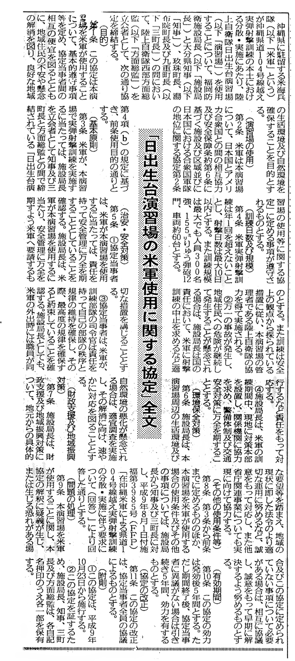 また、日出生台では「米軍使用協定」とともに「冬季の射撃は20時まで」とした「確認書」が結ばれている。