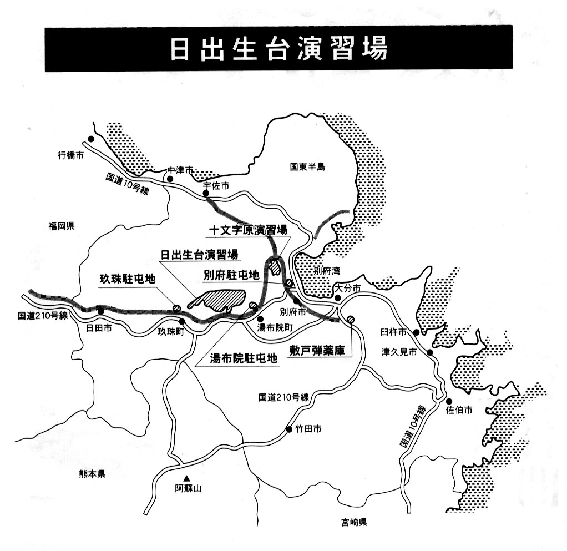 キロ、総面積は約4900ヘクタールの西日本最大の演習場。現在、日出生台演習場では、一年間に330日(うち実弾演習は230日)とほぼ年中無休で演習が行われている。