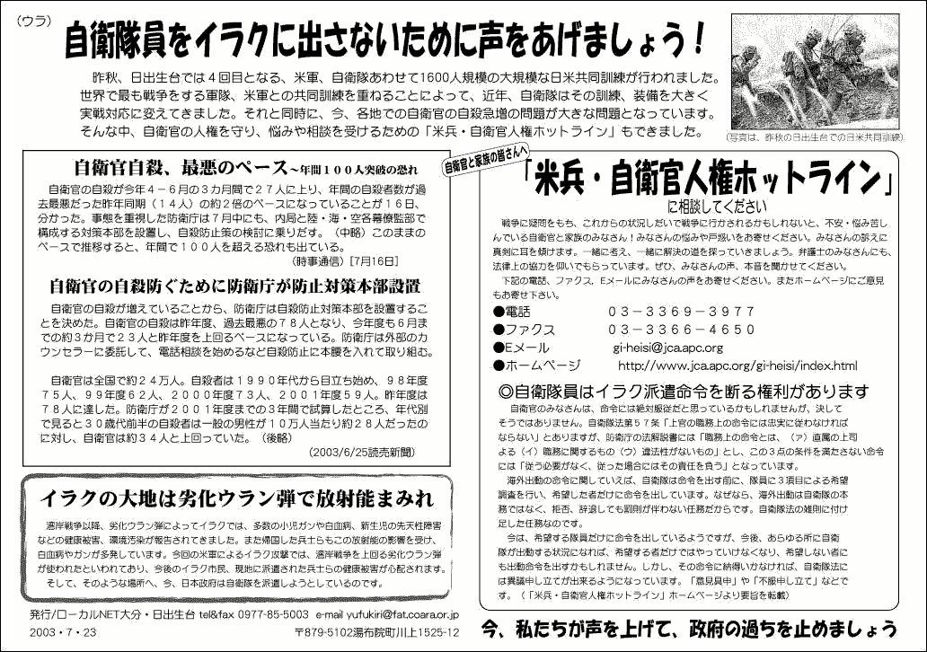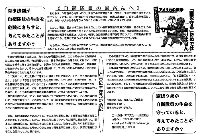 今、その政府を動かすことができるのは、私たち住民、市民、県民、国民の世論をおいて他にないと考え、私たちはこの訴えをおこなっています。今からでも遅くはありません。取り返しのつかない事態になる前に、今回の第7次復興支援群の派遣を中止し、現在イラクにいるすべての自衛隊を撤退させる決断を下すことを要請します。2005年7月29日 ローカルネット大分・日出生台