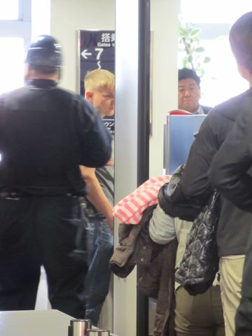 この2人の男女は、 他の米兵らとは別にチェックイン入り口に向かったのだが、 その後ろを日通の2人組ガードマンらが しっかりとガードしながらついて行く。
