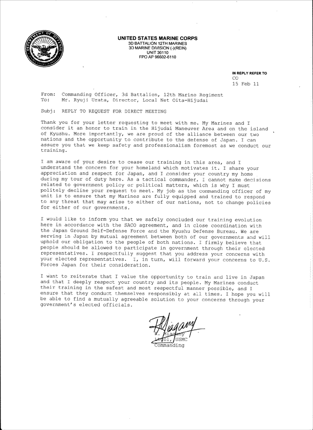 この日も集団外出の可能性があったので、 日出生台演習場のゲート前に車を止めて待っていたら、 防衛局の職員が一通の封筒を持ってきて、くれました。 中には以下の手紙。 米軍指揮官ミアガニー中佐からです。