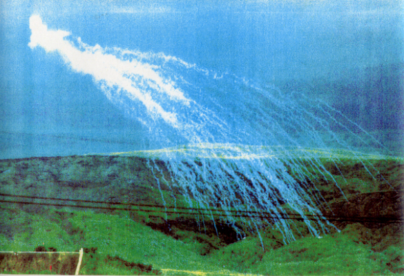 これは北海道矢臼別での訓練で米軍が使用した発煙弾。監視をする地元市民団体の人々はこれを「タコクラゲ弾」と呼んでいたが、「白リン弾ではないのか」との指摘に米軍は首を降り続けて来たが、ついに昨年の矢臼別訓練でようやく米軍はそれが「白リン弾」であることを認めた。非常に特徴的な煙が上がるので、他の砲弾との区別は一目瞭然。